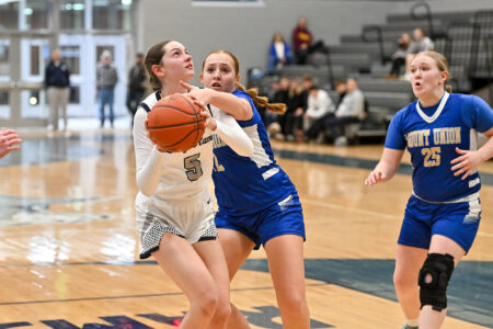 - TIM WEIGHT/For the Express Penns Valley’s Paige Johnson (5) drives to the basket during a girls basketball game against Mount Union on Friday, Jan. 2, 2026, at Penns Valley. The Rams won 52-15.