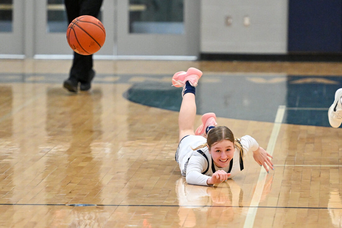 TIM WEIGHT/For the Express Penns Valley's Sydnie Dalton (11) dives for a loose ball during a girls basketball game against Mount Union on Friday, Jan. 2, 2026, at Penns Valley. The Rams won 52-15.