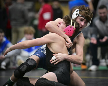 - RALPH WILSON/For the Express Jersey Shore’s Tobias Morgret wrestles Hughesville’s Kile Hartman at 160 during the semifinal rounds of the PHAC wrestling championships at Bloomsburg University on Saturday.