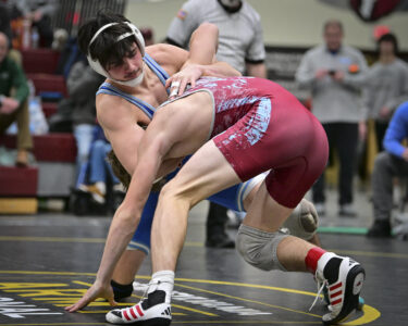 - RALPH WILSON/For the Express Williamsport’s Collin Nasdeo wrestles Central Mountain’s Gavin Heverly at 127 during the semifinal rounds of the PHAC wrestling championships at Bloomsburg University on Saturday.