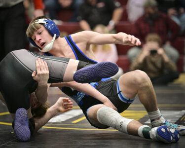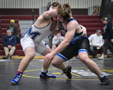- RALPH WILSON/For the Express Montoursville’s Teli Bobotas wrestles Central Mountain’s Patrick Tarantella at 133 during the semifinal rounds of the PHAC wrestling championships at Bloomsburg University on Saturday.