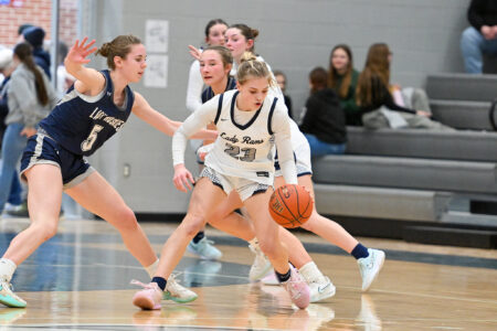 - TIM WEIGHT/For the Express Penns Valley’s Elle Dinges (23) dribbles back to the arc during a girls basketball game against Bishop Carroll on Friday, Jan. 30, 2026, at Penns Valley. The Rams fell 60-39.