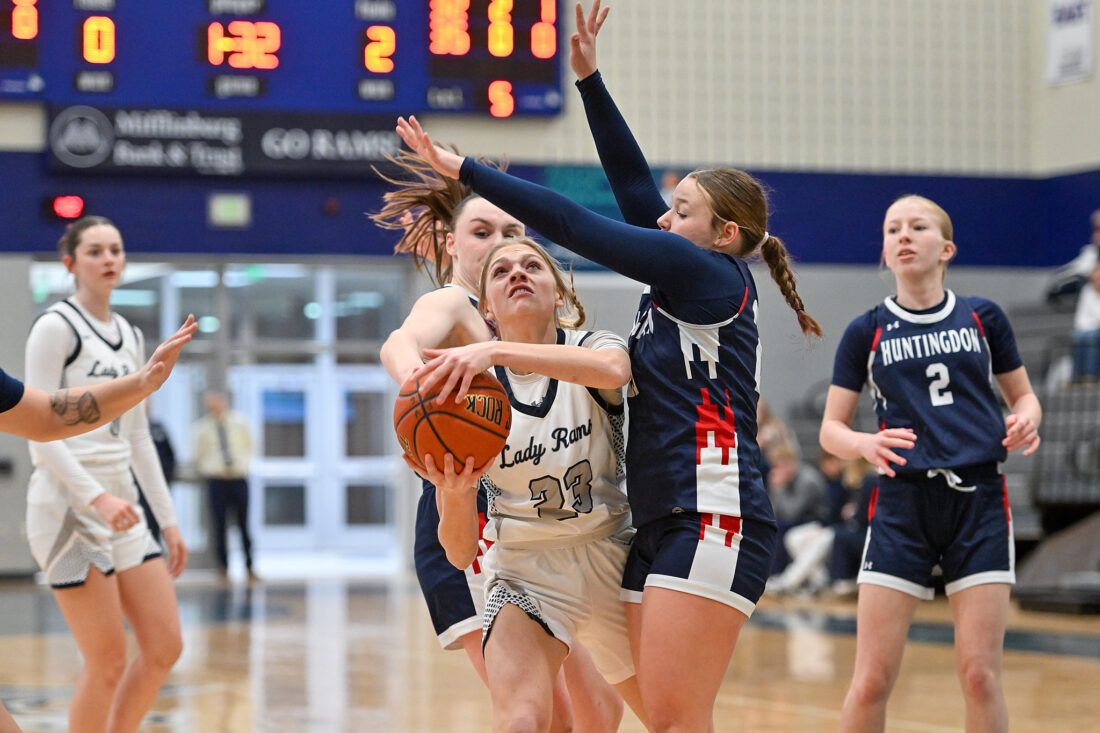 - TIM WEIGHT/For the Express Penns Valley’s Elle Dinges (23) drives past a Huntingdon defender during a girls basketball game against Huntingdon on Monday, Jan. 19, 2026, at Penns Valley. The Rams won 67-47.