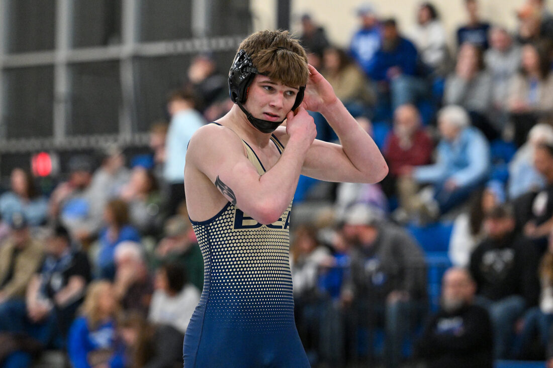 TIM WEIGHT/For the Express Bald Eagle's Caden Judice adjusts his head gear during a dual against Central Mountain earlier this season. Judice is seeded No. 2 at 145 in the District 6 Class AA wrestling tournament.