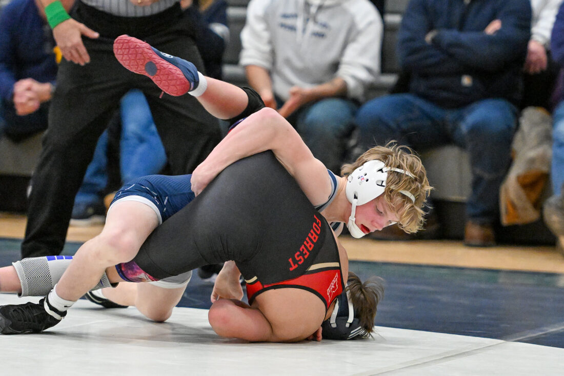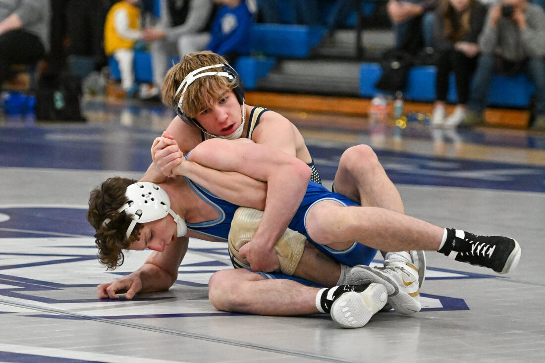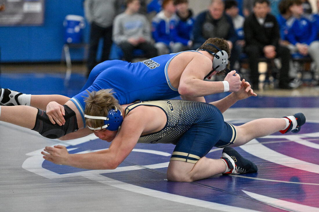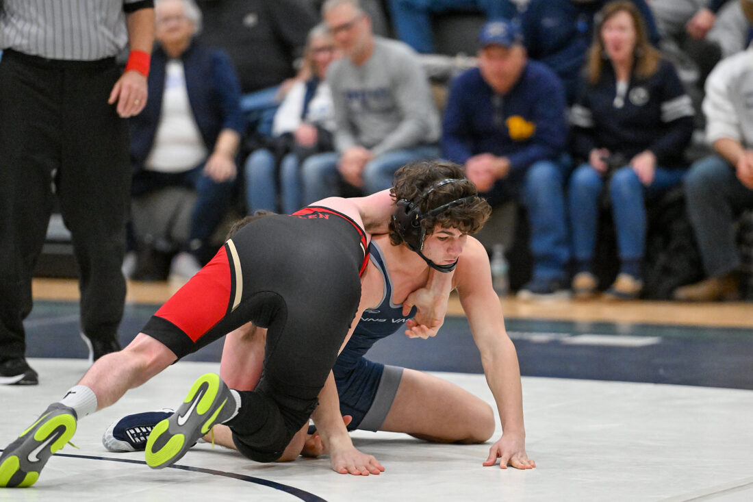 TIM WEIGHT/For the Express Penns Valley's Max Dinges wrestles during the District 6 Class AA Dual final against Bishop McCort on Saturday, Jan. 31, 2026. Dinges is seeded No. 1 at 121 in the District 6 Class AA wrestling tournament.