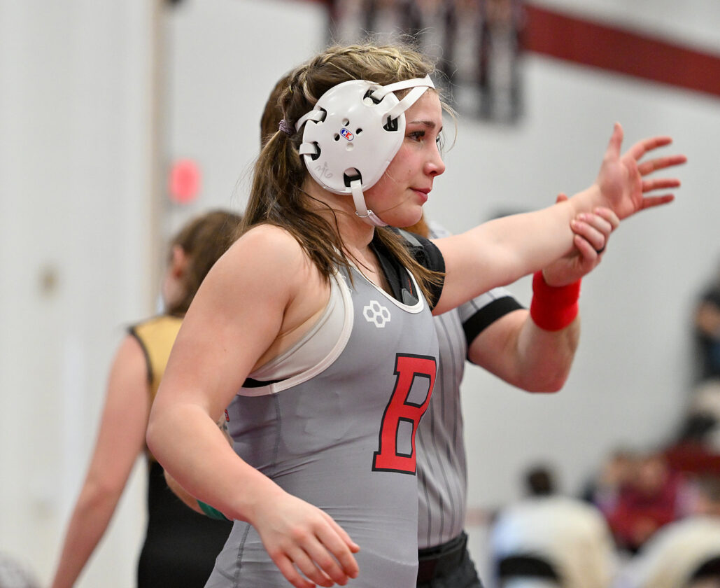 TIM WEIGHT/For the Express Bellefonte’s Bailee Scott gets her hand raised after a win during the District 5/6/9 girls wrestling championships at Altoona on Saturday.