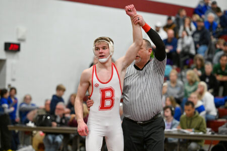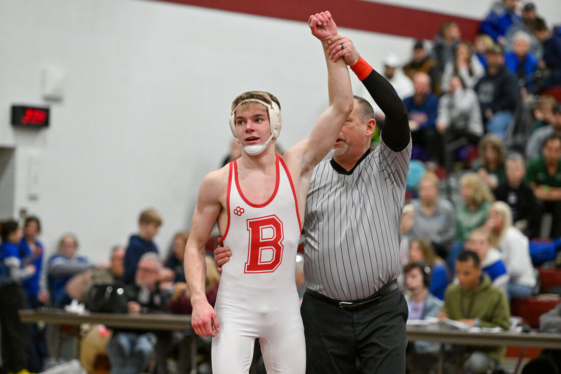 - TIM WEIGHT/For the Express Bellefonte’s Jackson Long get his hand raised during a dual against Clearfield at Bellefonte earlier this season.