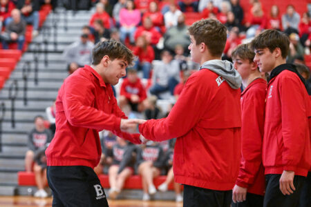 - TIM WEIGHT/For the Express Bellefonte’s Luke Hockenberry, left, high fives Jackson Long, right, before a dual against Clearfield at Bellefonte earlier this season.