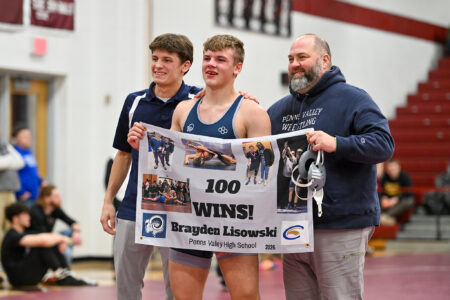 - TIM WEIGHT/For the Express Penns Valley’s Brayden Lisowski holds up a banner celebrating surpassing 100 career wins during Day One of the District 6 Class AA wrestling championships on Friday, Feb. 13, 2026, at Altoona.
