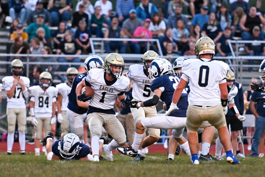 - TIM WEIGHT/For the Express Bald Eagle Area’s Kollin Cunningham (1) runs the ball during a football game against Penns Valley during the 2025 season.
