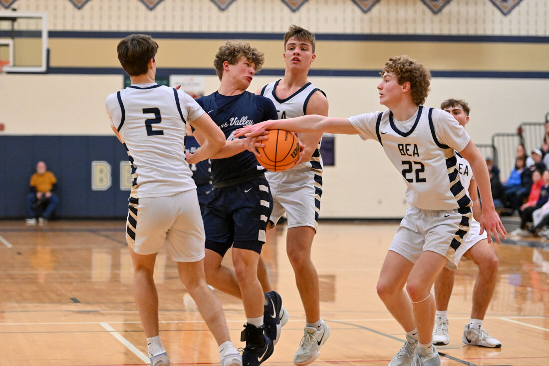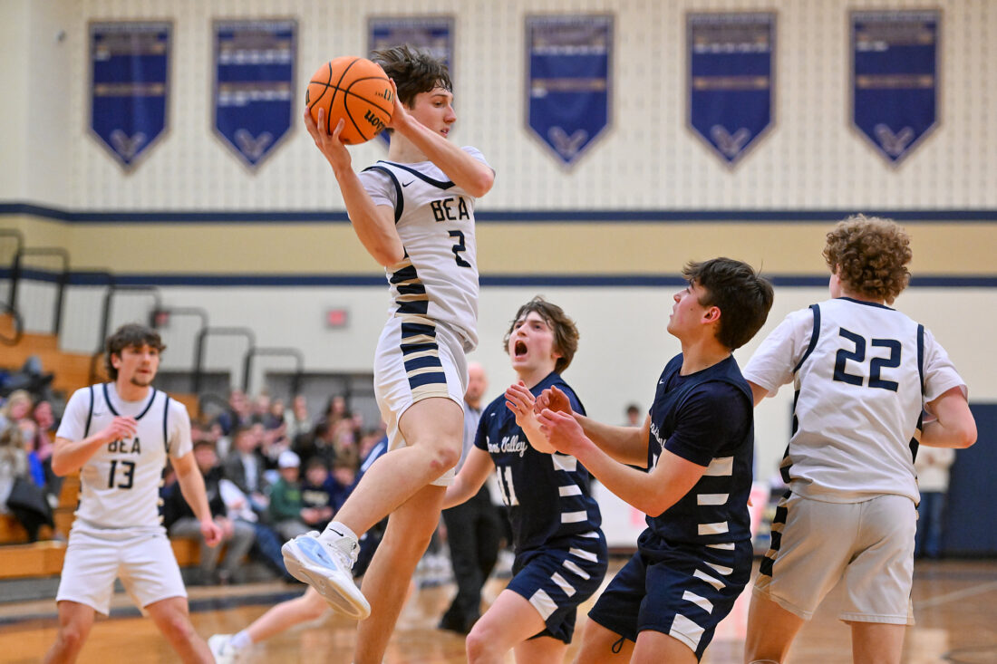 - TIM WEIGHT/For the Express Penns Valley’s Spencer Althouse (14) attempts to reel in a rebound against multiple Bald Eagle defenders during a boys basketball game on Friday, Feb. 6, 2026, at Bald Eagle Area. The Rams won 49-42.