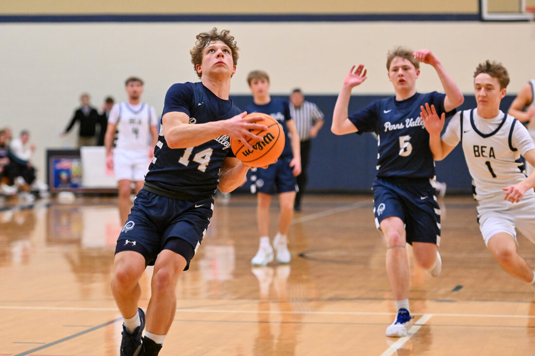TIM WEIGHT/For the Express Penns Valley's Spencer Althouse (14) takes an open layup on a fastbreak during a boys basketball game on Friday, Feb. 6, 2026, at Bald Eagle Area. The Rams won 49-42.