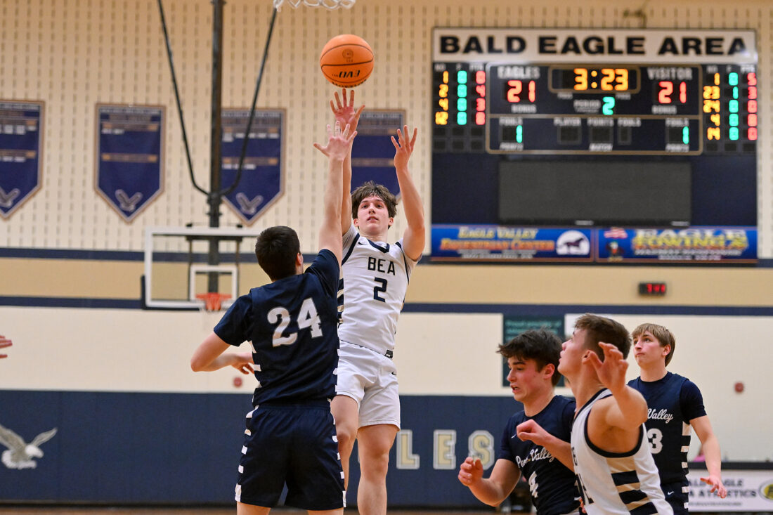 - TIM WEIGHT/For the Express Bald Eagle’s Luke Hosband (2) takes a shot over Penns Valley’s Austin Fetterolf (24) during a boys basketball game on Friday, Feb. 6, 2026, at Bald Eagle Area. The Rams won 49-42.