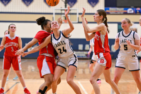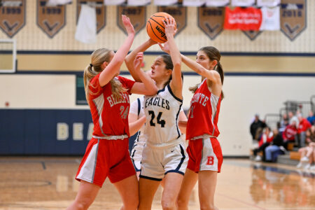 - TIM WEIGHT/For the Express Bald Eagle’s Kinsey Clark (24) battles Bellefonte’s Gigi Jasseh, left, and Talia Cotter, right, for a rebound during a girls basketball game at Bald Eagle Area on Monday, Feb. 9, 2026. The Eagles won 41-31.
