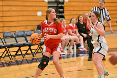 - TIM WEIGHT/For the Express Bellefonte’s Aubrey Mason (24) looks to pass the ball as Bald Eagle’s Addison Mottin (5) defends during a girls basketball game at Bald Eagle Area on Monday, Feb. 9, 2026. The Eagles won 41-31.