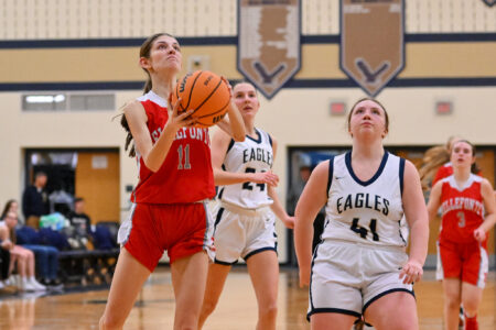 - TIM WEIGHT/For the Express Bellefonte’s Talia Cotter (11) takes a layup during a girls basketball game at Bald Eagle Area on Monday, Feb. 9, 2026. The Eagles won 41-31.