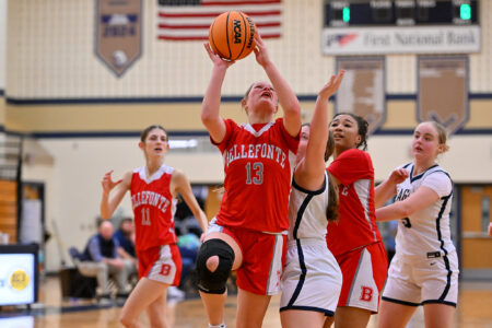 - TIM WEIGHT/For the Express Bellefonte’s Ava Lose (13) shoots a contested layup during a girls basketball game at Bald Eagle Area on Monday, Feb. 9, 2026. The Eagles won 41-31.