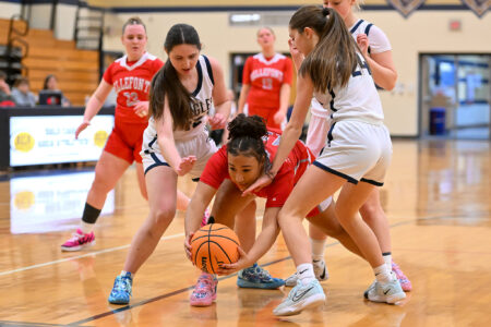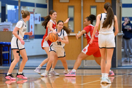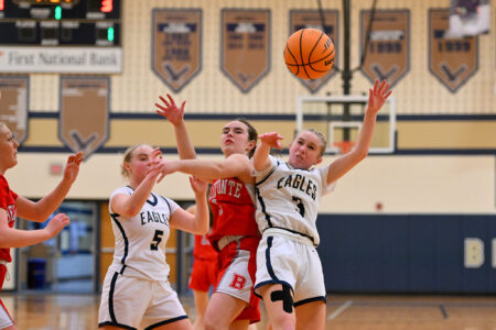 Numerous Bald Eagle and Bellefonte players battle for possession during a girls basketball game at Bald Eagle Area on Monday, Feb. 9, 2026. The Eagles won 41-31.