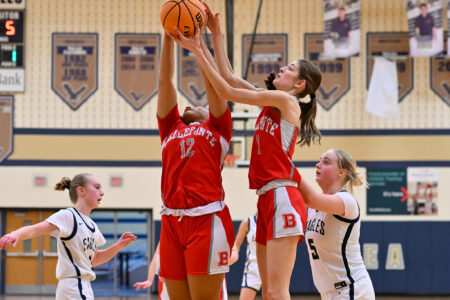 - TIM WEIGHT/For the Express Bellefonte’s Gigi Jasseh (12) and Talia Cotter (11) reach for a rebound during a girls basketball game at Bald Eagle Area on Monday, Feb. 9, 2026. The Eagles won 41-31.