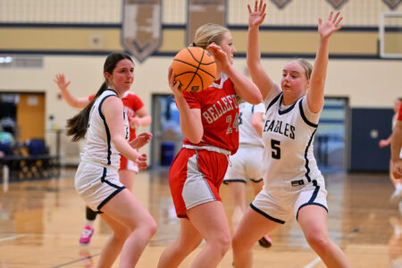 Bellefonte's Addison Mottin (5) works against the defense of Bellefonte's Gigi Jasseh, left, and Anika Fetzer, right, during a girls basketball game at Bald Eagle Area on Monday, Feb. 9, 2026. The Eagles won 41-31.