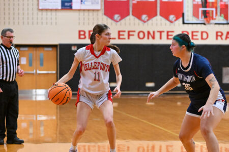 - TIM WEIGHT/For the Express Bellefonte’s Talia Cotter (11) goes through her progressions Bellefonte’s Talia Cotter (11) works against a Huntingdon defender during a girls basketball game against Huntingdon on Thursday, Feb. 12, 2026, at Bellefonte.