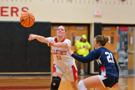 - TIM WEIGHT/For the Express Bellefonte’s Ava Lose (13) makes a pass Bellefonte’s Talia Cotter (11) works against a Huntingdon defender during a girls basketball game against Huntingdon on Thursday, Feb. 12, 2026, at Bellefonte.