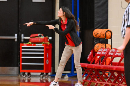 Bellefonte head coach Marissa Ward gives her players directions Bellefonte's Talia Cotter (11) works against a Huntingdon defender during a girls basketball game against Huntingdon on Thursday, Feb. 12, 2026, at Bellefonte.