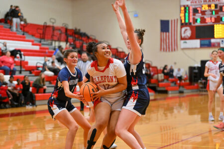 - TIM WEIGHT/For the Express Bellefonte’s Anika Fetzer (22) drives to the basket Bellefonte’s Talia Cotter (11) works against a Huntingdon defender during a girls basketball game against Huntingdon on Thursday, Feb. 12, 2026, at Bellefonte.