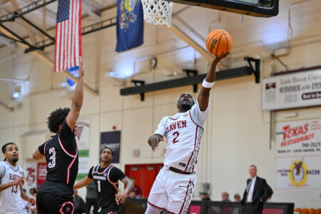 - TIM WEIGHT/For the Express Lock Haven’s Dean Coleman-Newsome (2) takes a layup during a men’s basketball game against East Stroudsburg on Wednesday, Feb. 18, 2026, at Thomas Fieldhouse. The Bald Eagles fell 80-76.