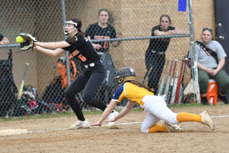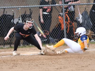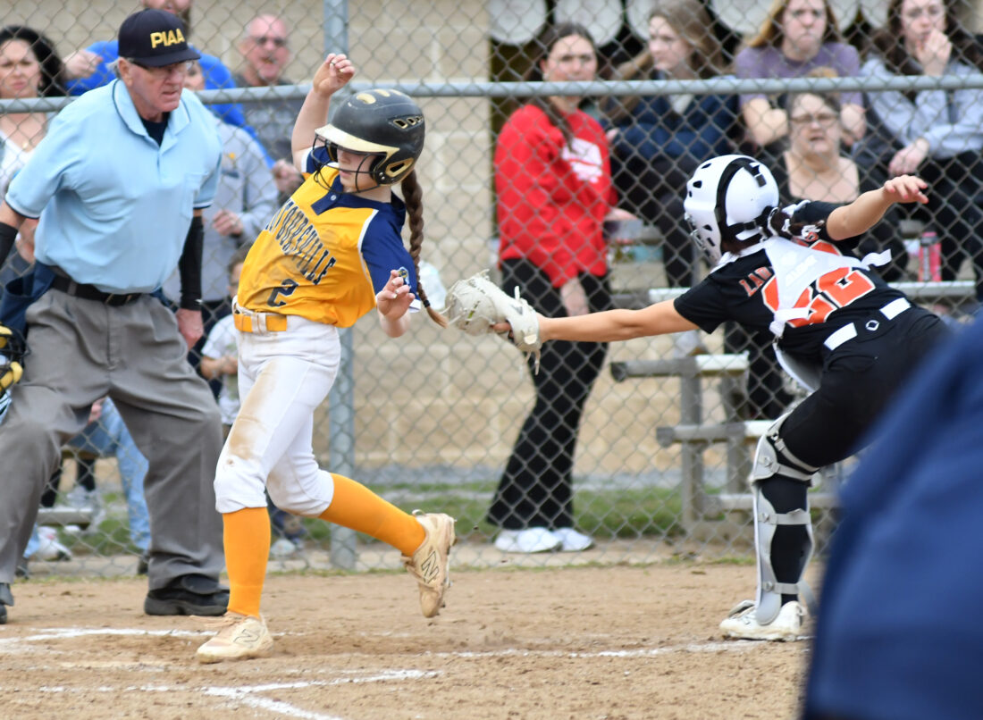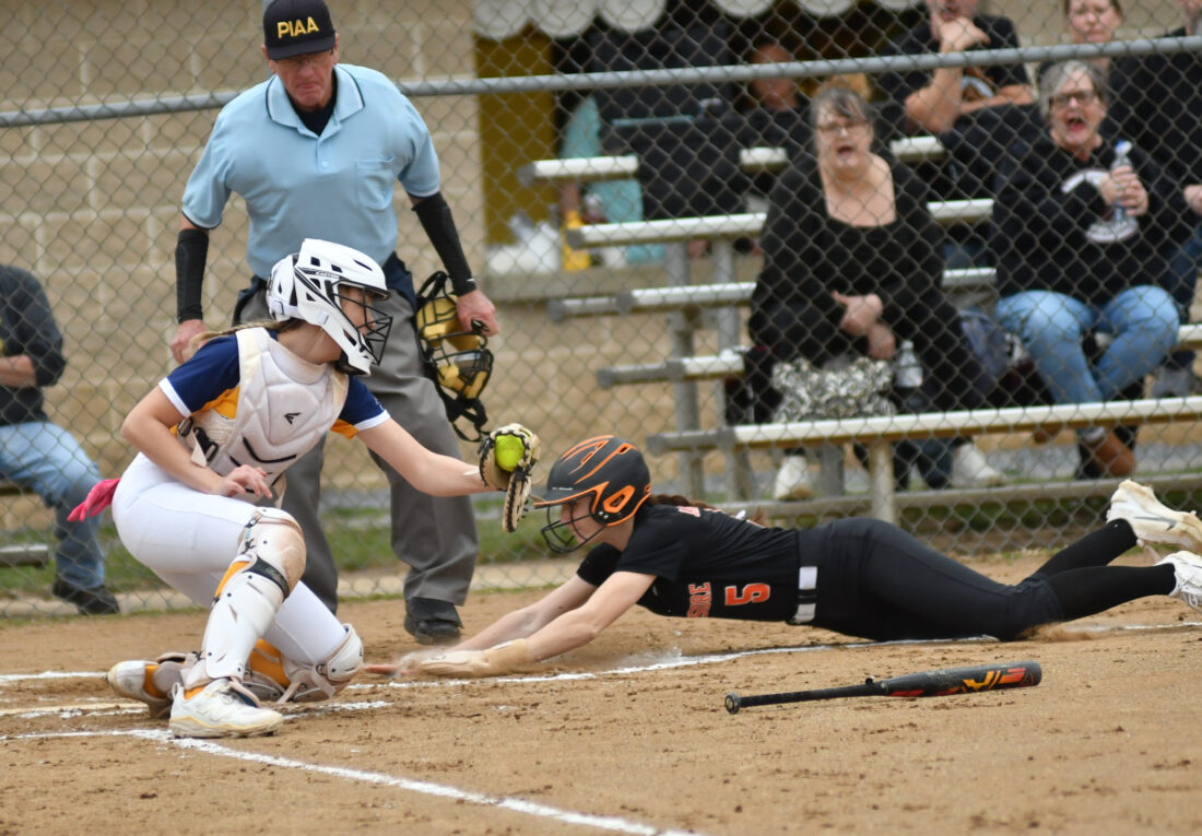 - MARK NANCE/For The Express Montoursville’s Emma Ammerman (2) is out at home as Jersey Shore catcher Annika Clark (22) goes for the tag in the fifth inning.