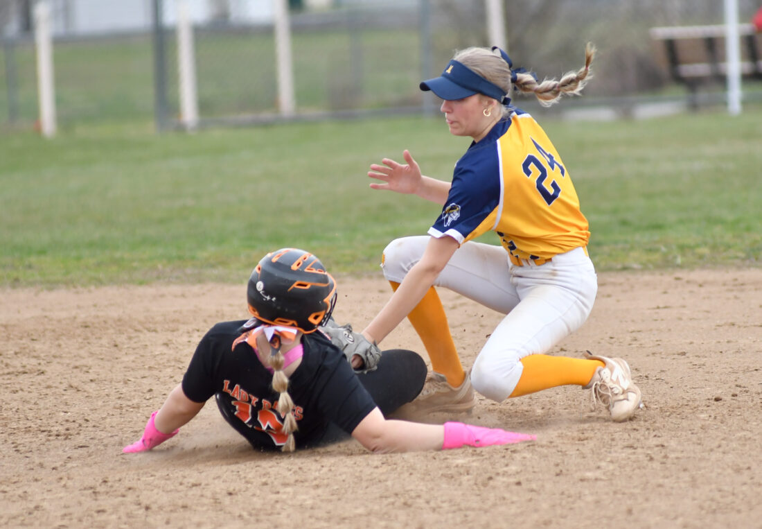 - MARK NANCE/For The Express Jersey Shore’s Lexi Frey (13) is safe at second base as Montoursville short stop Emily George (24) goes for the tag in the fifth inning.