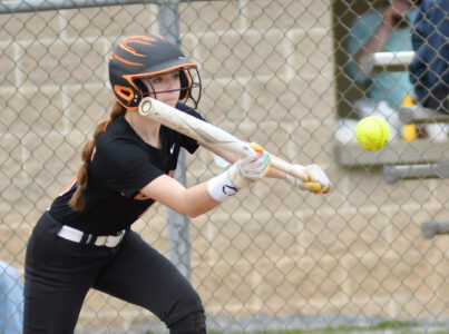 - MARK NANCE/For The Express Jersey Shore’s Maddi Thomas (9) attempts a bunt in the third inning.