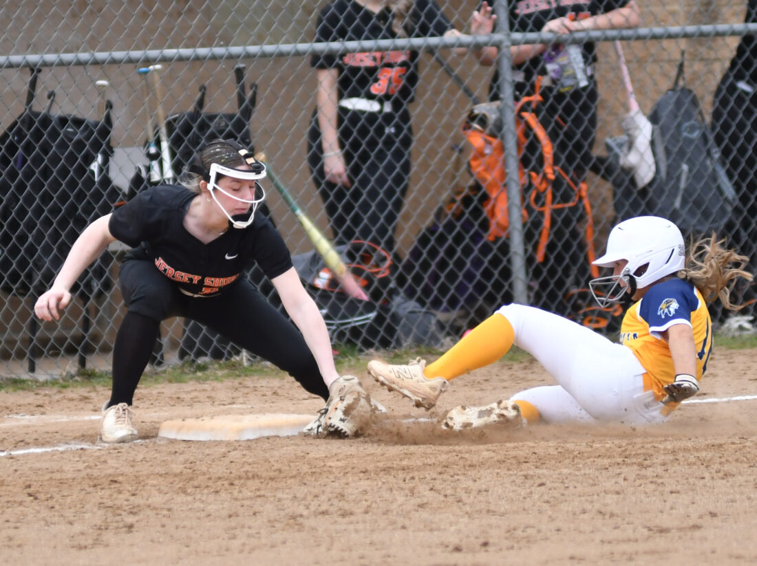 - MARK NANCE/For The Express Montoursville third baseman Kayleigh Sheleman (4) is ready for the tag on Jersey Shore’s Lexi Frey (13) in the fifth inning.