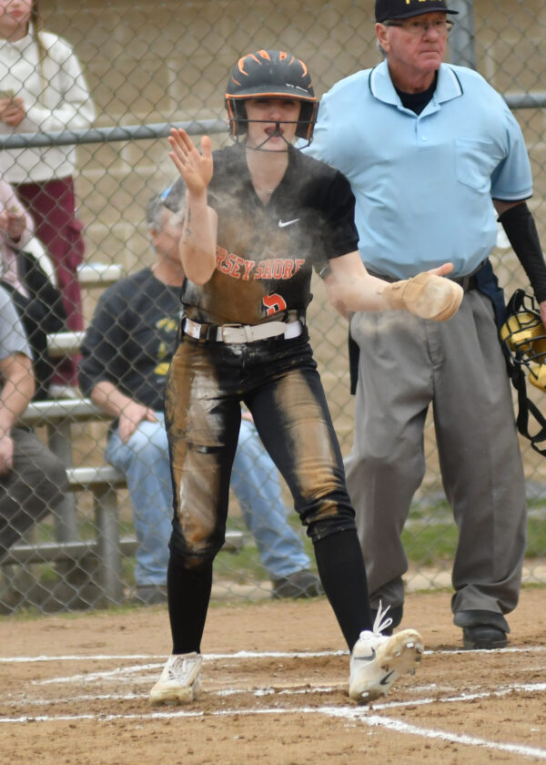 MARK NANCE/For The Express Jersey Shore's Dani Miller (5) celebrates after safely stealing home on a sacrifice fly in the first inning.