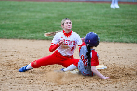 - TIM WEIGHT/For the Express Bellefonte’s Sloan Moore tags a runner out at second during a softball game against Central on Thursday, March 19, 2026, at Bellefonte. The Red Raiders won 8-3.