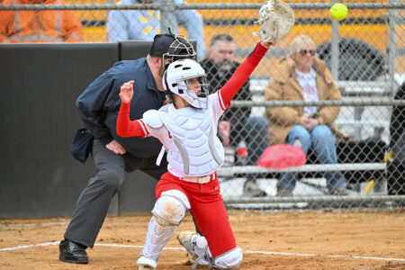 - TIM WEIGHT/For the Express Bellefonte catcher Ella Herr catches a pitch during a softball game against Central on Thursday, March 19, 2026, at Bellefonte. The Red Raiders won 8-3.
