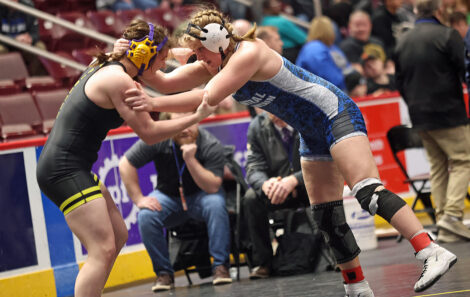 Central Mountain’s Kendall Wagner competes in the PIAA girls wrestling championships in Friday’s quarterfinals in the morning session at Hershey’s Giant Center.