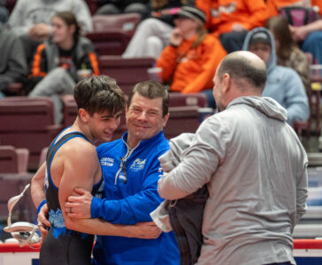 Aiden Kunes of Central Mountain celebrate with his coaches after defeating Jack Campbell of Nazareth Area during the PIAA State Wrestling Championships at the Giant Center in Hershey.