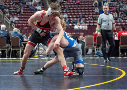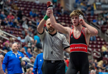 Ezra Swisher of Bellefonte defeats Luke Lilley of Connellsville during the PIAA State Wrestling Championships at the Giant Center in Hershey.