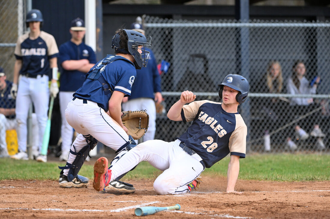 - TIM WEIGHT/For the Express Bald Eagle’s Hayden Stimer slides home during a high school baseball game against Penns Valley on Wednesday, April 1, 2026, at Penns Valley. The Eagles fell 6-4.