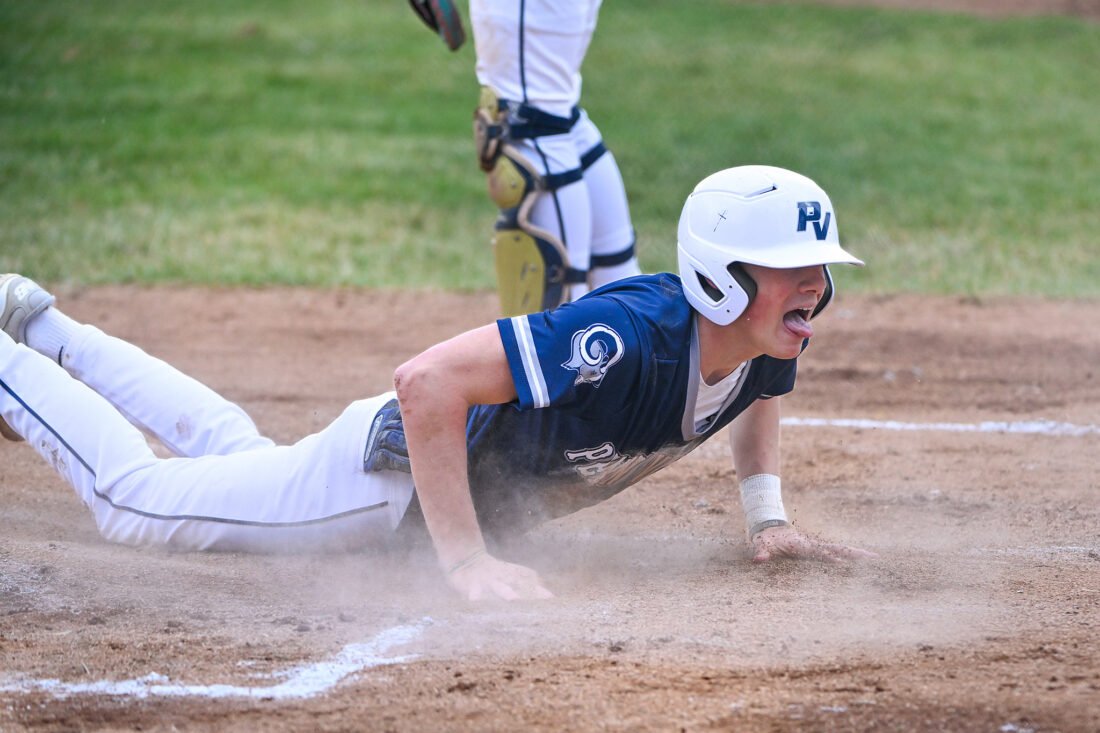 - TIM WEIGHT/For the Express A Penns Valley runner celebrates after getting home during a high school baseball game against Bald Eagle on Wednesday, April 1, 2026, at Penns Valley. The Rams won 6-4.