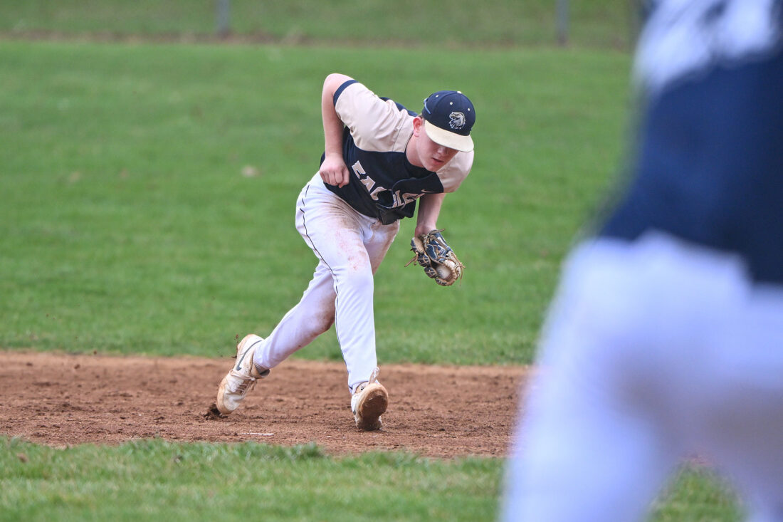 TIM WEIGHT/For the Express A Bald Eagle infielder fields a ball during a high school baseball game against Penns Valley on Wednesday, April 1, 2026, at Penns Valley. The Eagles fell 6-4.