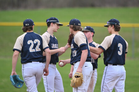 - TIM WEIGHT/For the Express Bald Eagle baseball players meet at the mound before an inning during a high school baseball game against Penns Valley on Wednesday, April 1, 2026, at Penns Valley. The Eagles fell 6-4.