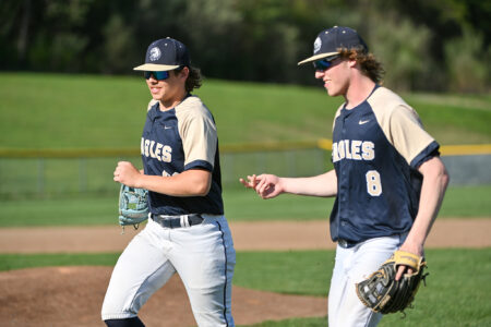 Defense took center stage in the fifth as the Eagles ended a possible scoring run with a double play. Hosband led off the fifth with a walk. Irion tied the game as he hit a smoker over the left field fence, scoring himself and Hosband.