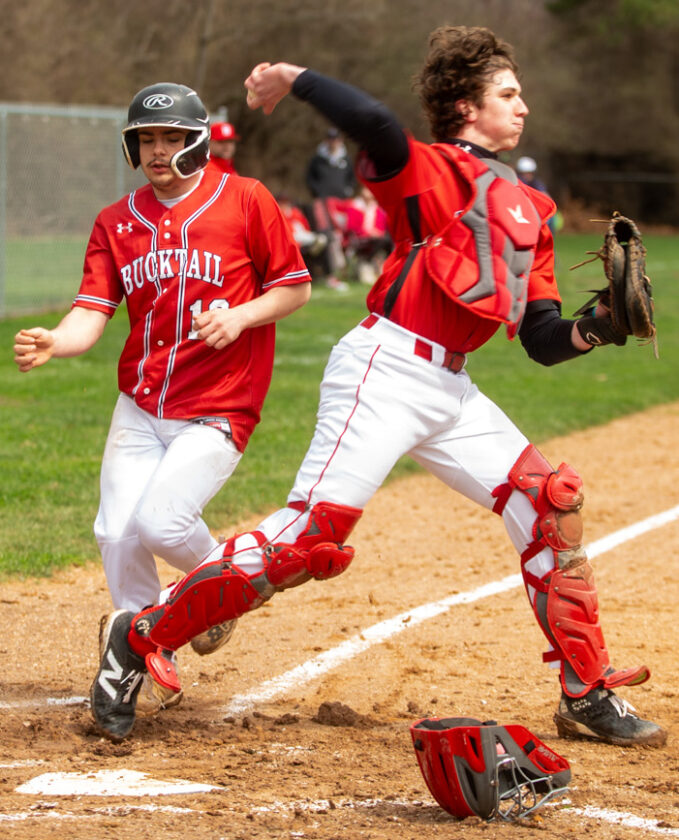 KEVIN RAUCH/For the Express Montgomery catcher Lincoln Miller forces Bucktail’s Levi Stevenson out at home before firing the ball down to first to complete a double play during Friday’s baseball game at Bucktail.