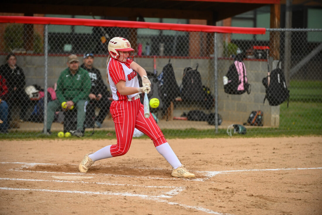 - KEVIN RAUCH/For The Express Bucktail’s Eva Sockman picked up one of her four hits in the second inning as the Bucks improved to 6-2 on the season, in the first of their four game home stand this week.