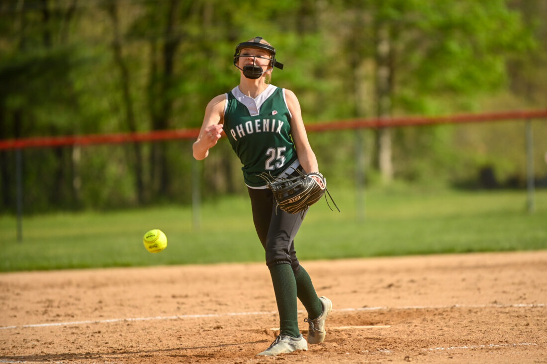 - KEVIN RAUCH/For The Express Phoenix freshman Abigail Immel threw well in Farwell on Monday afternoon, but an explosive Bucktail line-up claimed a 13-0 win on their home field.