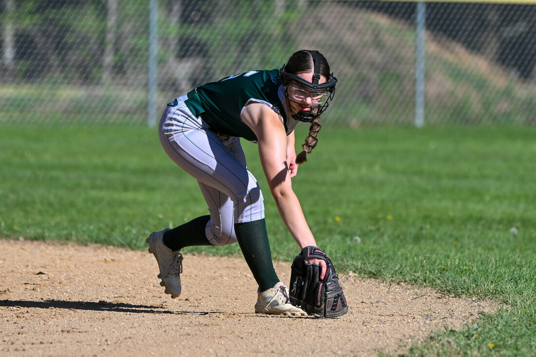 - TIM WEIGHT/For the Express Sugar Valley’s Lyla Breon (5) picks up a loose grounder during a softball game at against Bucktail on Monday, April 27, 2026. The Bucks won 18-1 in three innings.