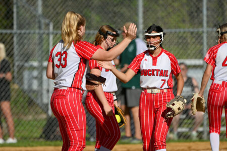 - TIM WEIGHT/For the Express Bucktail’s Kendall Wagner (33) high fives Makenna Stone (7) during a softball game at Sugar Valley on Monday, April 27, 2026. The Bucks won 18-1 in three innings.