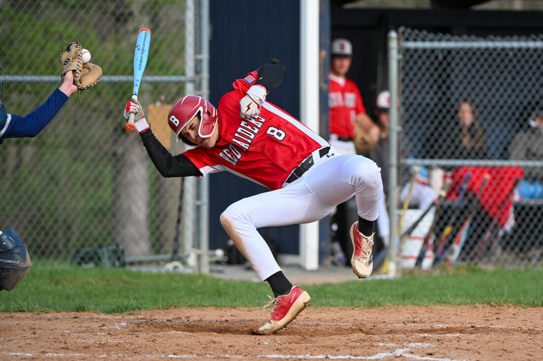TIM WEIGHT/For the Express Bellefonte's Evan Mattern (8) avoids an inerrant pitch during a high school baseball game at Penns Valley on Monday, April, 20, 2026. The Rams fell 13-0 in five innings.
